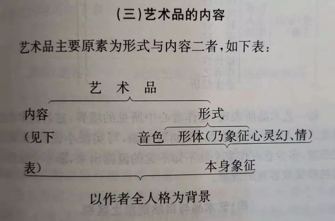 形式者如全体结构,颜色的组合,音阶的排列,节奏的调和皆是,形式系由表现冲动而生,各艺术家之情感经历不同,表现冲动亦异,故形式亦因之终无相同者,情感经历,表现之冲动人人皆有而形式化创造力,则非艺术家不能办。