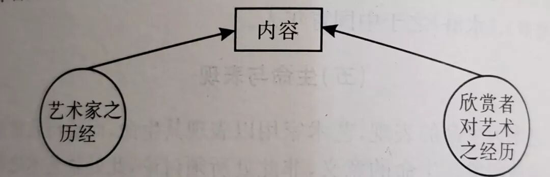 如上所言,艺术品之内容,以人之生命的经历为出发点,艺术家用一种方式表现其经历,即成艺术品之内容,如下图所示为以艺术家之经历为出发点,经表现而成为艺术之内容,内容即艺术之终点: