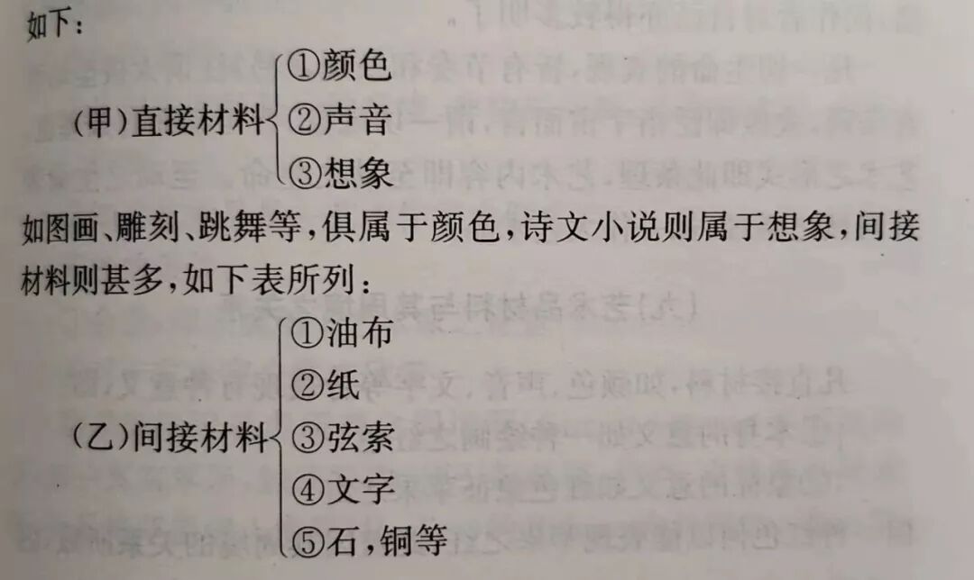 间接材料,于艺术表现方面,无甚多之直接影响,但于艺术创造方面,则颇有关,盖一切理想之艺术创造,每受此间接之材料所预先限制与支配也。