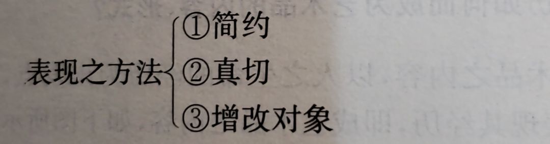 简约即删减之意,盖某山某水,仅一部分能引起艺术家之情感,故其馀不能发生情感者,则删减之而不表现,但同时表现方面亦有过分之要求故艺术家报告其心中之情感除简约真切外,尚须增减其对象,兹再列表如下