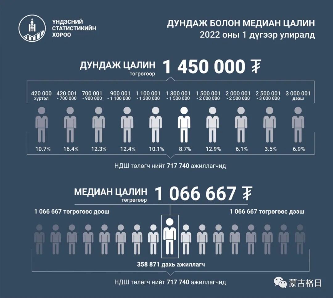 蒙古国全国平均工资的中位数是将71.8万缴纳社保金的人,按照工资收入,从最低到最高排序,取排列中间一组的数据。