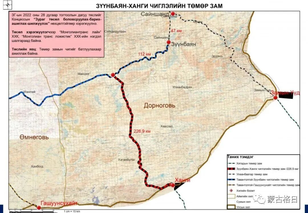 据蒙古GoGo网11月24日报道,作为蒙古国政府“新复兴政策”的一个重要项目,宗巴音至杭吉口岸新建铁路将于明天即11月25日正式通车。