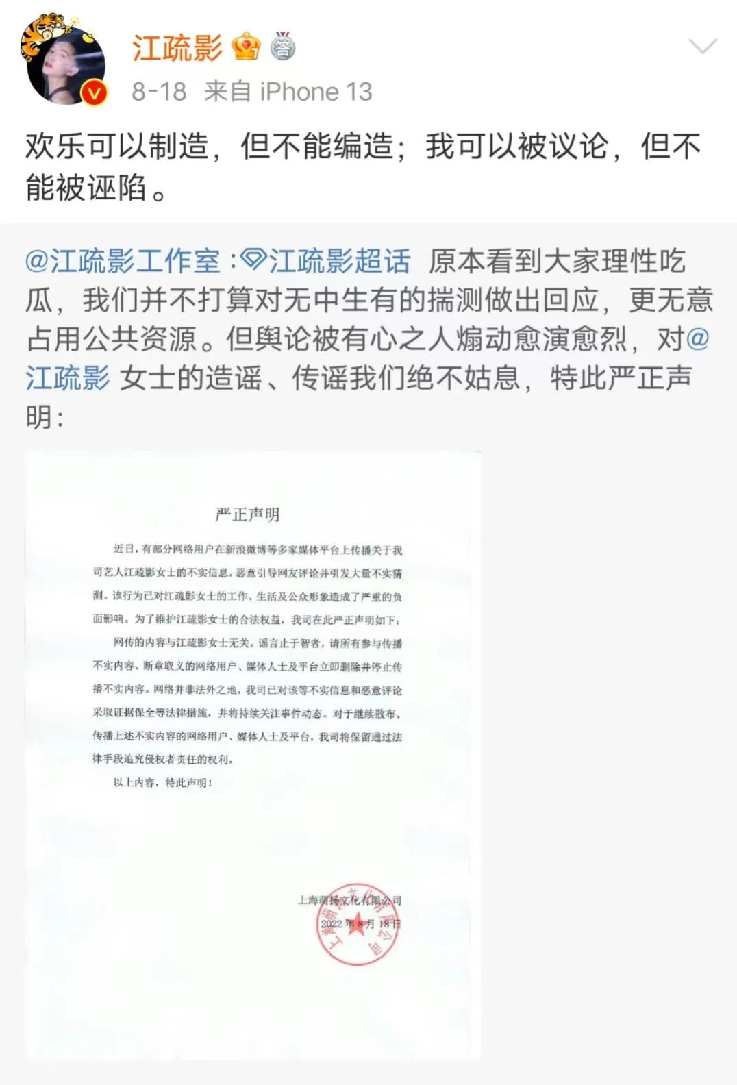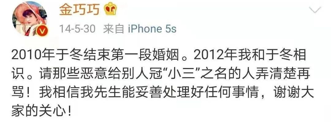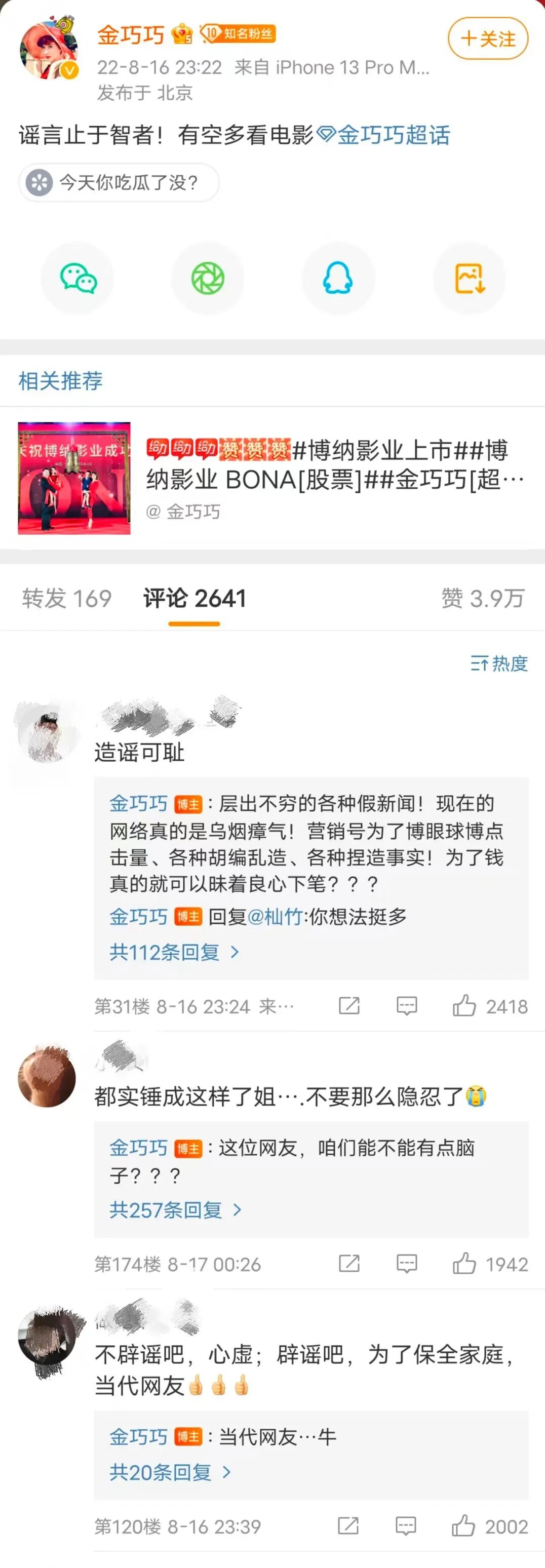 而在江疏影回应之前,于冬妻子、影星金巧巧是最先坐不住的。8月16日当天深夜,她就发微博说:“谣言止于智者!有空多看电影。”在这条微博的评论区,金巧巧继续发言:层出不穷的各种假新闻!现在的网络真的是乌烟瘴气!营销号为了博眼球博点击量,各种胡编乱造,各种捏造事实!有网友在评论中提到:都实锤成这样了姐……不要那么隐忍了。金巧巧怒怼:“这位网友,咱们能不能有点脑子???”8月18日凌晨,心有不甘的金巧巧,二次发文回应此事,直接@ 爆料博主称:“我也很好奇,你说的这三个人到底是谁?”一副身正不怕影子的样子,把“正宫娘娘”的气势拿捏地死死的。![]()