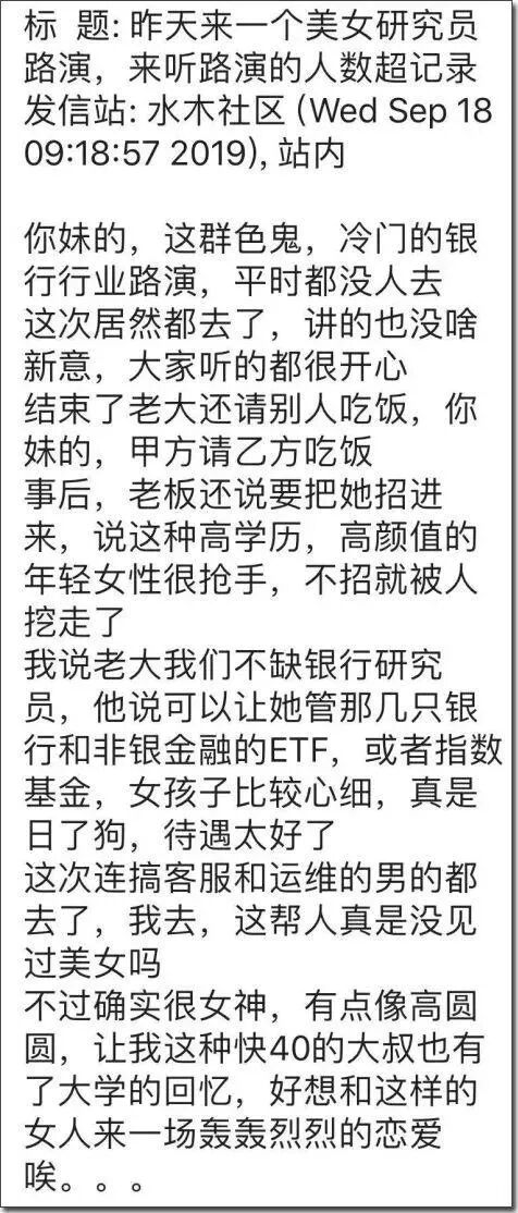 参选世界小姐可能在秦泽文的意料之外,但努力进入金融圈却是不争的事实。不知道大家发现没有,金融圈的美女确实比较多。秦泽文的高颜值毋庸置疑,近年来,像她这样高颜值在金融圈大有人在,甚至到了“某券商个别团队人均李嘉欣、范BB”的程度。下面这张图片是2019年某券商债券销售团队美女合影照片,当时在网上引起热议。2021年12月24日,东兴证券一组债券产品的发行宣传照出圈。5位来自东兴证券债券承销团队的女生,妆容精致楚楚动人,大玩“下半身失踪”。还有中泰证券的某女销售,朋友圈照片尺度大到惊人,评论区却淡定写着:“欢迎和中泰合作,您的投融资伙伴”。因高颜值人群太多,演艺圈与金融圈看似不搭嘎的两个圈子,这两年频繁出现相互“跨界”的现象。比如,曾参加过《创造营2020》的李丞汐,曾放弃香港亚投行等金融机构的高薪工作,进入演艺圈转型演员。2019年曾出演过《小重逢》《沙海》《白发》等影视剧的青年演员邹新宇,选择转行跳槽到国金证券做销售服务岗。不过她在转正短短2个月后就离职了。金融圈不是靠智商的吗?怎么,漂亮的颜值难道真能当饭吃?据说在深圳金融领域,个别美女销售员的跳槽转会费就曾高达数百万,身价堪比某些券商首席经济学家。像上面列举的“金融美女天团”大多来自债券销售领域,美女的存在简直就是这项业务的定海神针,对内鼓舞士气,对外就是“攻无不克”的生产力。这个很好理解,对于手握大把钞票的中年男人来说,拒绝一位美女的销售邀约总是艰难一些。金融圈的工作内容不会因为是美女而改变,依旧是枯燥的数字和冗长的报告,但如果这些是从一个美女嘴中讲出来,至少它不会是一件让人讨厌的事情。连一向以“内在美”著称的基金经理、券商研究员也开始颜值化。不少金融机构纷纷给自家分析师、基金经理打上“90后女神”“基金圈长发小S”的标签。网上有个帖子,本来无人问津的银行路演,因一位颜值堪比高圆圆的美女研究员到来而变得“万人空巷”。路演结束后,出现了甲方爸爸请乙方吃饭的场景,还打算将美女招至麾下......金融圈公认的美女,某券商分析师鹿鸣深有感触地说道: