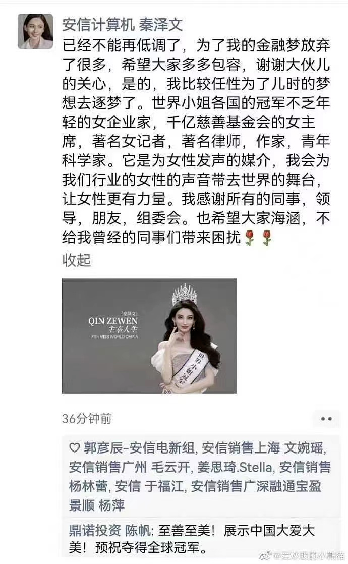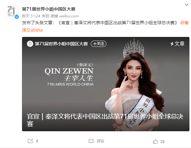 根据公众号平台最新的推送规则,如果不想错过八妹的文章,记得标星标哦,以前加过的也需要重新添加,这样每次新文章推送才会第一时间出现在你的订阅列表里。人生总会有遗漏,但是不要忘记 “添加星标”哦!!!8月22日晚,第71届世界小姐中国区大赛微博官宣:“秦泽文将代表中国区出战第71届世界小姐全球总决赛。”让人惊艳的是,秦泽文容貌姣好身量高挑,虽没有模特背景,但有名校硕士学历,曾在国际大公司实习,还有券商工作经历。高学历美女、金融圈、选美比赛,画面感是不是一下子全有了,秦泽文也飞速出圈,赢得一片赞叹。不过,才过去一天多,网友发现此事有诸多怪异的地方,比如她的学历,还有此次比赛的参赛资格,都谜一般的不真实。![]()