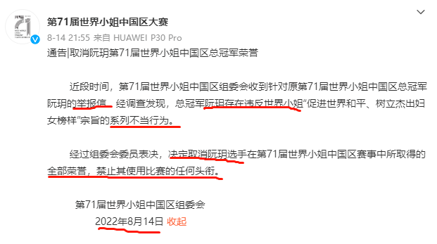 第71届世界小姐中国区总决赛于2021年11月结束,夺冠的是来自湖北武汉的阮玥。今年8月14日,组委会公告称收到针对阮玥的举报信,发现她存在违反世界小姐“促进世界和平、树立杰出妇女榜样”宗旨的系列不当行为。因此,组委会决定取消阮玥在赛事中所取得的全部荣誉,禁止她使用比赛的任何头衔。根据各国选美比较成熟的经验来看,冠军取消了名次,后面的亚军唐苏苏、季军胡可瑜递补即可。为什么会选择没有名次记录的秦泽文,代表中国区参加世界小姐的比赛呢?对此,组委会相关负责人对外表示:“暂不回应,请等待官方通知。”23日晚,“第71届世界小姐中国区大赛”发布微博文章《希冀|祝愿秦泽文在71届世界小姐全球总决赛中摘冠而归!》,文中似乎给出了解释: