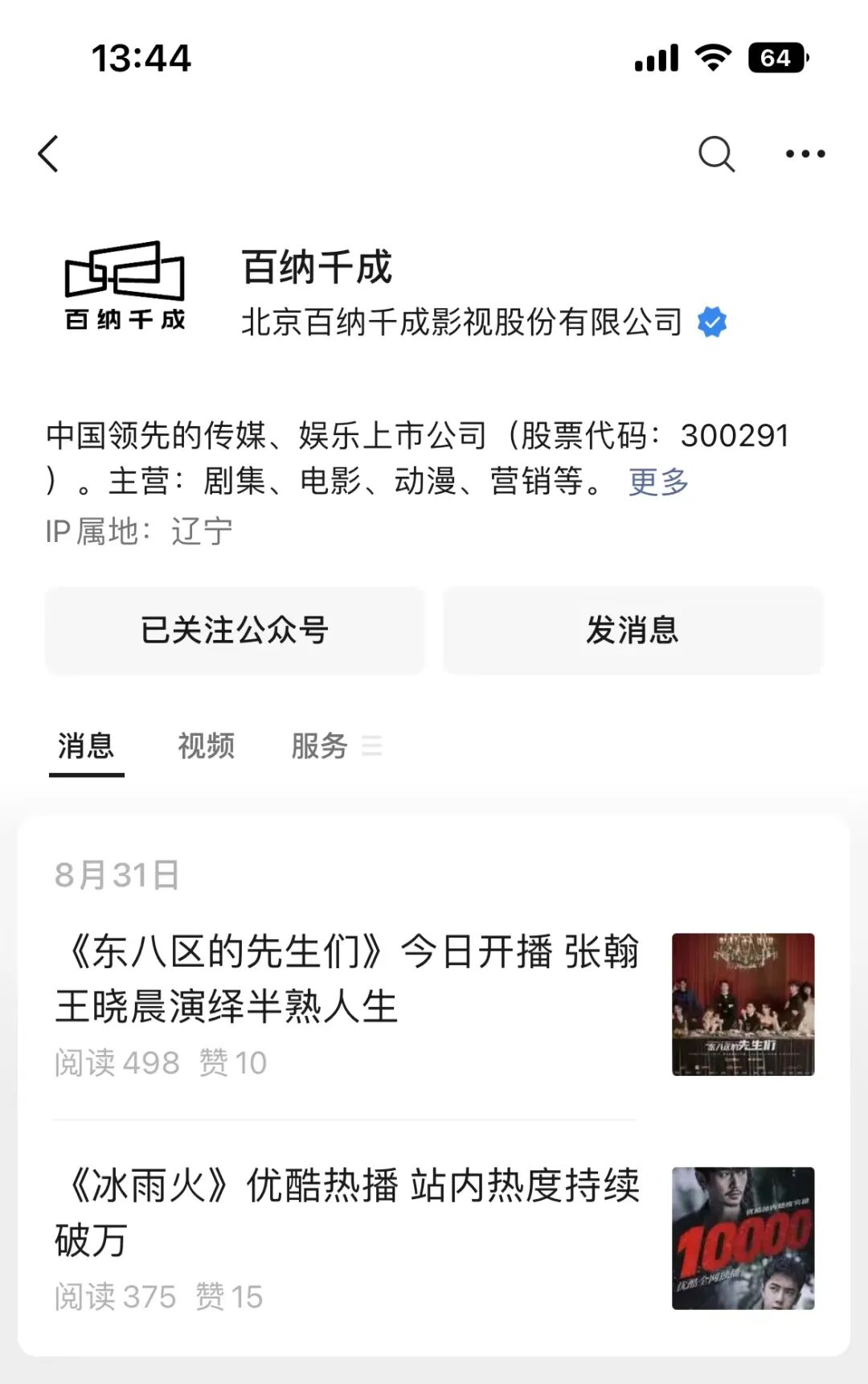 目前,百纳千成公众号最新推文还停留在8月31日《东八区》的开播信息上。