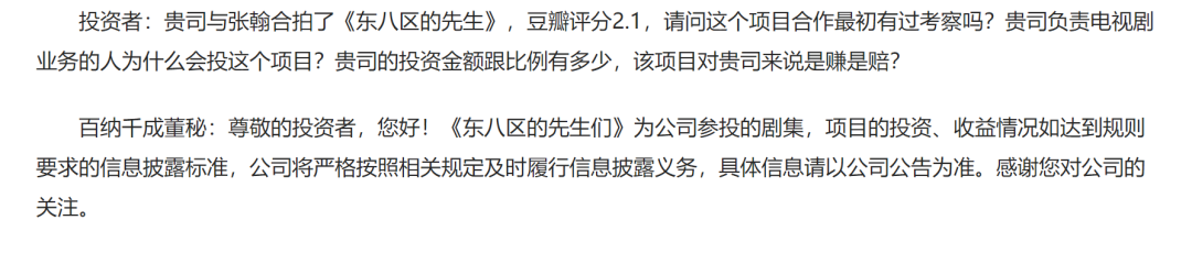 即便如此,百纳千成作为A股上市公司,投资《东八区》“翻车”事件还是引来了投资者的质疑,有投资者在公开平台上直接询问董秘“豆瓣评分2.1,请问这个项目合作最初有过考察吗?”