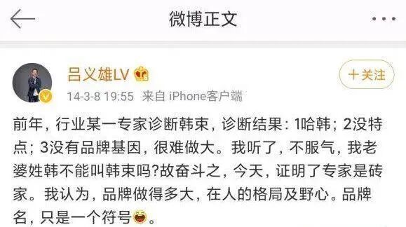 但之后韩流降温,吕义雄欲遮还显,发文表示“不服气”,称“我老婆姓韩不能叫韩束吗?”不过,吕义雄这番辩白,还是显得有点力不从心。