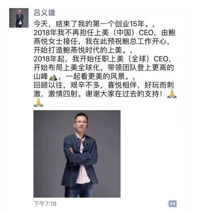 除了请“漂姐”担任上美集团副总裁,吕义雄还高薪挖来了“前欧莱雅中国副总裁”鲍燕悦,并且让出了自己上美(中国)CEO的职位,成为当年化妆品行业中一大“盛事”。
