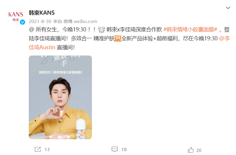 之后,韩束又趁热打铁与李佳琦合作,发布的韩束情绪小胶囊面膜,登上直播间热门位,1秒售罄、4次补货、坐稳当场直播的“销冠”。