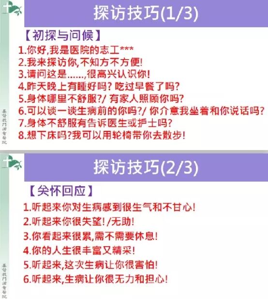 而陪伴的方式便是“倾听”。虽然在老师专门整理了探访的问题,但是“问”不是重点,它只是一个引导,重点还是要去听,我们要去听患者灵性的语言。