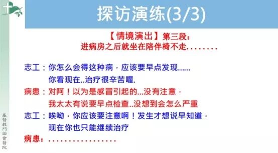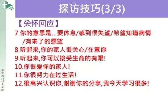 在第二天培训结束的提问环节,有人问说探访的时长问题。老师表示其实每次个案大概十分钟至十五分钟。当然,如果遇到病人谈兴大发或是家属哭泣之类的情况,可以适度延长探访的时间。
