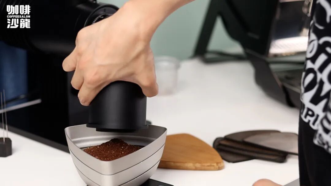 E6作为一台单份研磨的磨豆机,使用了等离子防飞粉技术,没记错的话是行业首创了,配合上非常短的通道,几乎不吃粉,搭载了58mm的感应称重粉杯可以直接进行布粉,测试过程中真的非常方便和轻松。