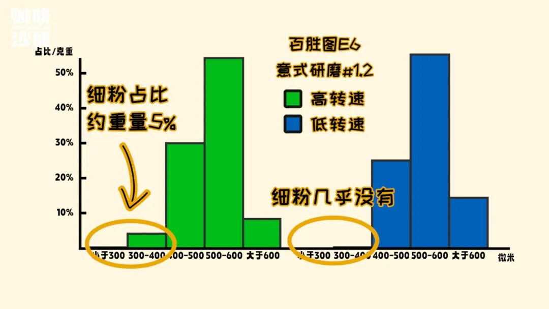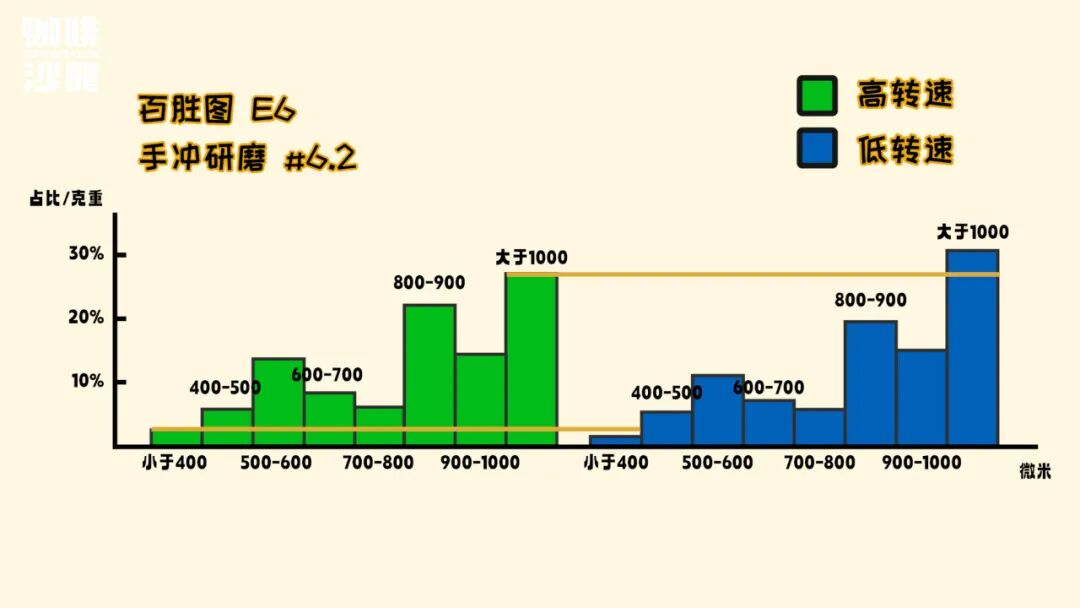 在相同研磨度下,使用不同转速的萃取,低转速的流速会快很多,因为它几乎没有400微米以下的细粉。
