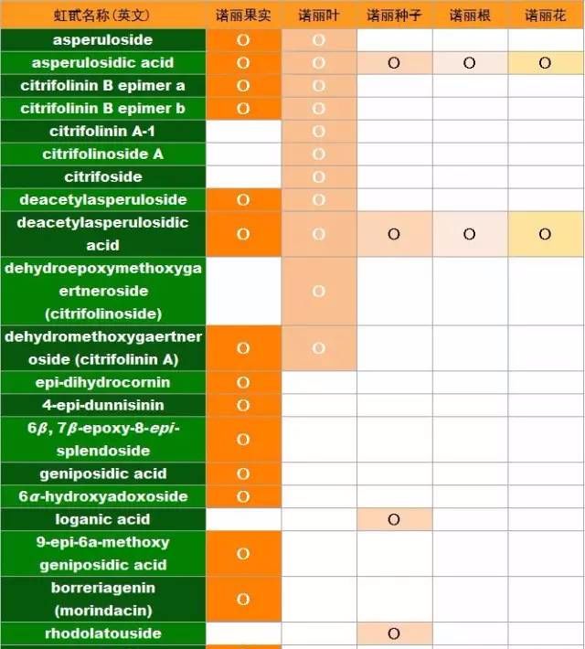 诺丽果中含有最多的虹甙类有DAA(去乙酰基车叶草苷酸)和AA(车叶草苷酸),除此以外,还含有橄榄苦苷、京尼平苷、马钱苷、莫诺苷、獐牙菜甙、水晶兰苷、珊瑚木苷、梓醇等其他虹甙类。根据诺丽果的相关研究发现,果实成熟后,果实中含有的虹甙量会有所增加。