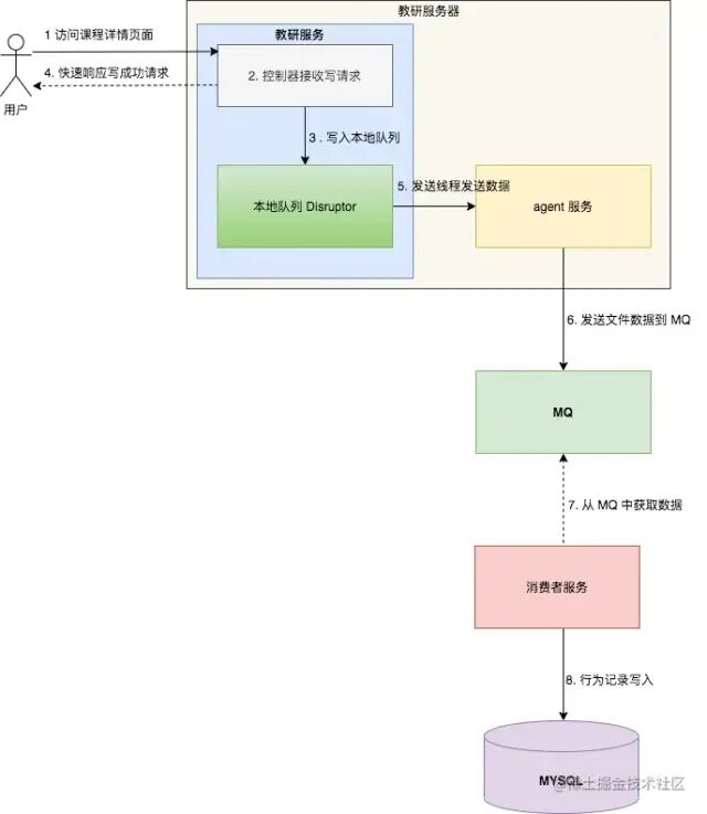 教研服务器上部署 Agent 服务(独立的进程) , 教研服务接收写请求后,将请求按照固定的格式(比如 JSON )写入到本次磁盘中,然后给前端返回成功信息。