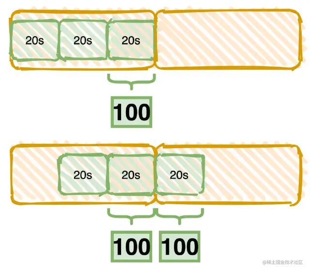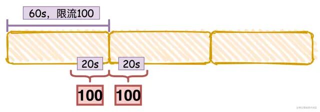 以下图举例子来说,假设我们的窗口拆分成了3个小窗口,小窗口都是20s,同样基于上面的例子,当在第三个20s的时候来了100个请求,可以通过。