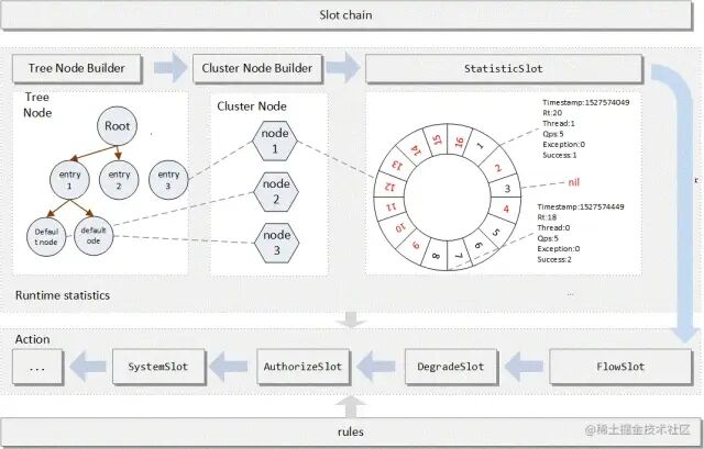 前期就是创建节点,然后slot串起来就是一个责任链模式,StatisticSlot通过滑动窗口来统计数据,FlowSlot是真正限流的逻辑,还有一些降级、系统保护的措施,最终形成了整个sentinel的限流方式。
