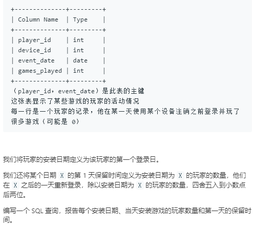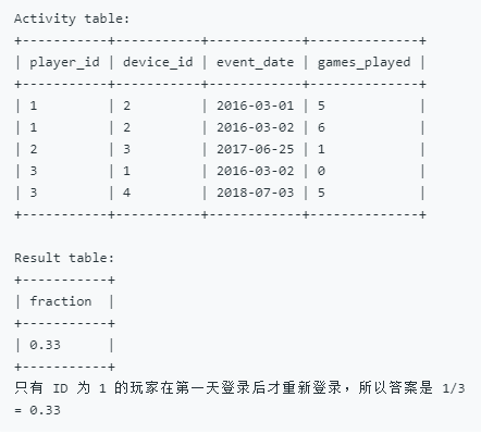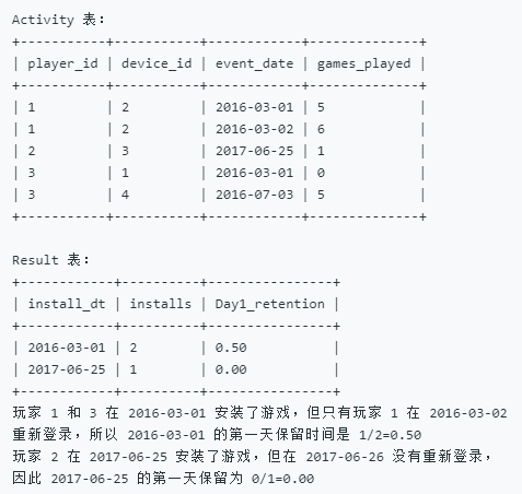 6 ( SELECT player_id, min( event_date ) AS install_dt FROM activity GROUP BY player_id ) t1