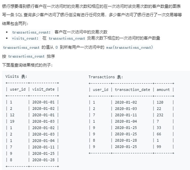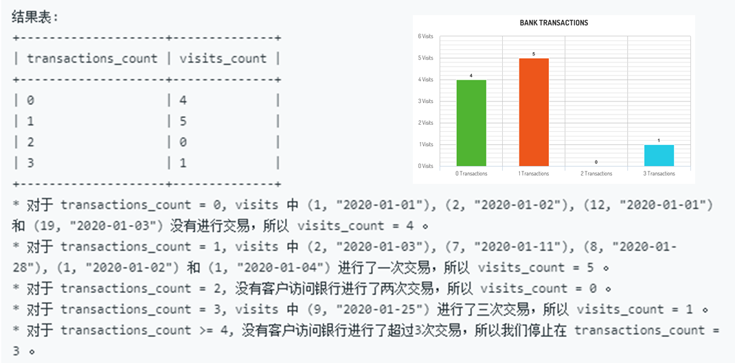 这个想法其实是没问题的,但缺少一种特殊情况:如果transactions表为空,此时意味着可能存在多次来访,但每次的交易次数都是0。而恰巧就是这个0也不能由transaction表依附生成。解决这个问题的方法有多种,比如我们可以将visits表和transactions表union后的结果作为依附表来生成编号,但那样未免有些牛刀杀鸡。考虑到transaction表无法解决的情况仅限于表为空、交易次数均为0的这种特殊情形,我们仅需简单的将上述结果union一个特殊的0确保生成的编号框架永不为空即可。同时设置@id从1开始计数。