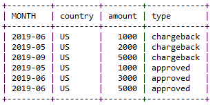 1SELECT DATE_FORMAT( c.trans_date, '%Y-%m' ) MONTH, country, amount, 'chargeback' type