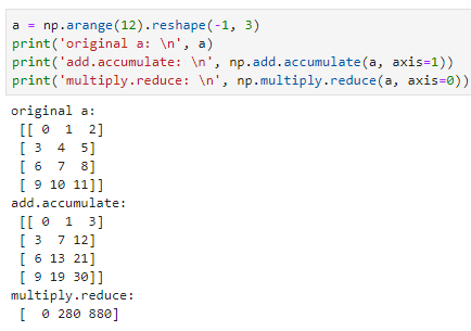 这部分内容比较基础,仅补充一个个人认为比较有用的ufunc加聚合的例子。ufunc本身属于方法(方法即是类内的函数接口),ufunc之上还支持4个方法: