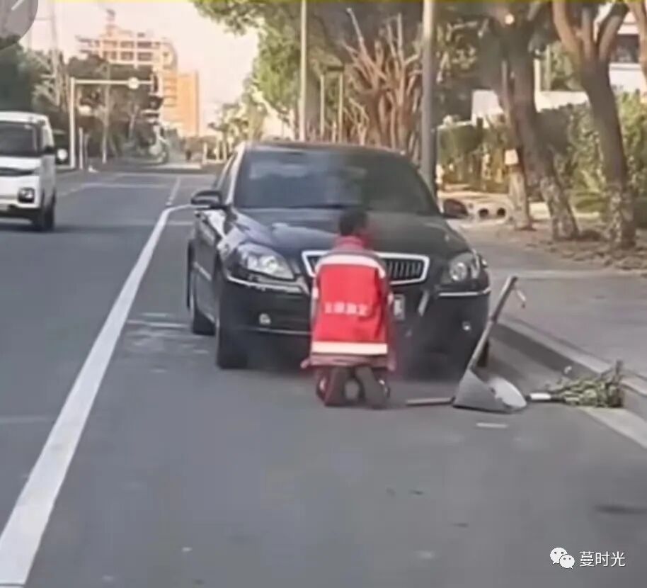 于是,身着橙色工服的环卫工人就当街独自跪在了一辆黑色的轿车车头......