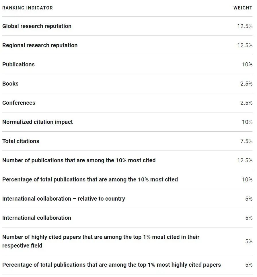 与往年相同,今年依然从13个方向来评估大学的综合水平并排名,包括:25%声誉指标(表内前2个指标)、65%文献计量指标、10%科学卓越指标(表内后2个指标)。