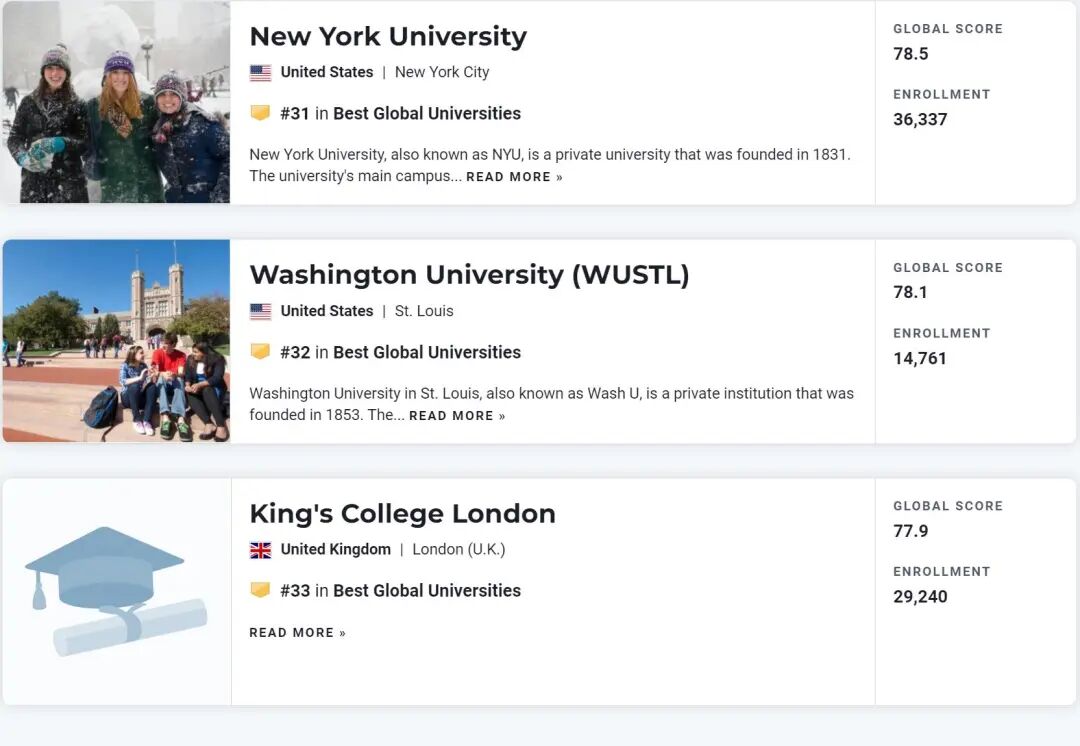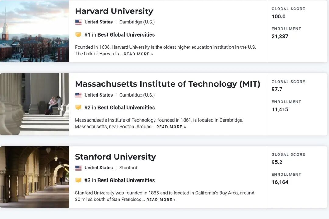 U.S. News世界大学排名对每个大学的学术研究表现及其全球和地区声誉的指标进行排名,可以清晰地看到世界顶尖学府在全球范围内的定位。