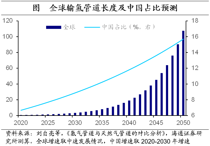 在储运的基础设施上,氢气管网建设有较大的发展空间。工业氢气运输主要以管道形式为主,低压管道运氢适合大规模、长距离的情况,在未来有极大的需求。全球在2020年共建成输氢管道6000公里,其中,中国仅有400公里,占比为6.7%。而根据刘自亮等的研究,预计在中速发展的情况下,到2050年全球将建成长距离和短距离输氢管道7.5万和100万公里,年均增速约为18.9%。中国预计到2030年将建成氢气管道3000公里,年均增速为22.3%,较全球增长更快。