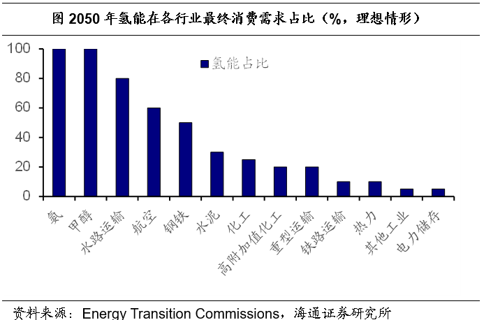 对比国际上的路线图,我们预计实际增速可能高于此,或将在6%左右。国际能源署在《2050年净零排放——全球能源部门路线图》中预测,为实现在2050年碳中和,全球对氢气的需求将从2020年的0.87亿吨增长至5.3亿吨,年均增长6.2%。而国际氢能委员会在2021年11月的报告《净零氢能报告》中也提到,为实现碳中和、全球降温1.5度的目标,到2050年,全球对氢气的需求为6.6亿吨,占全球最终能源需求的22%,年均增速达7.0%。这两个目标均较国内机构要更积极,也就是说,如果碳中和的进程需要加快,氢能源行业发展也会进一步提速。