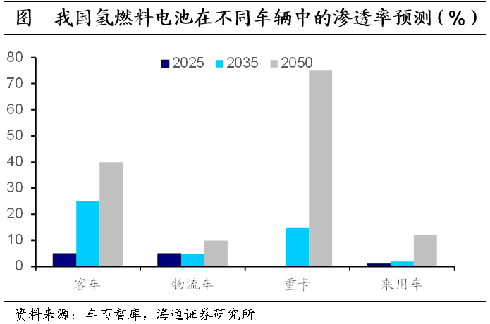 氢燃料电池在交通运输行业中的应用是未来的重要增长点。目前我国燃料电池汽车占新能源汽车销量的比重最高也不超过0.4%。其中,截至2020年8月,燃料电池车主要以物流车和客车为主,乘用车占比仅为0.1%,且主要用于租赁。根据车百智库的预测,氢燃料电池汽车保有量将在2025、2035和2050年分别达到10万、100万和3000万辆,年均增速约为25.6%,主要应用于重卡、客车等大型车辆中,在乘用车中的渗透率也将提高到12%。