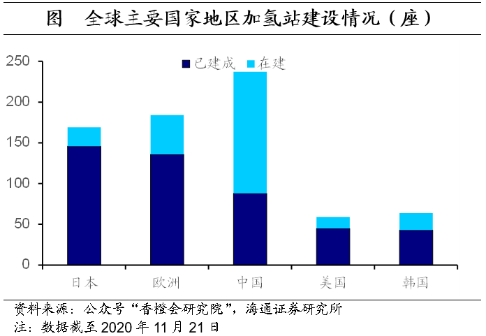 而氢燃料汽车的广泛应用,还需要基础设施,如加氢站的配套建设。截至2020年底,全球共建成加氢站约544座,其中我国128座,占比约为23.5%。根据《中国氢能与燃料电池白皮书(2019)》预测,我国加氢站数量在2035年将达到1500座,在2050年将达到10000座以上,为实现这一目标,加氢站数量的年均增速达15.6%。而根据香橙研究会统计的情况,当前我国加氢站建设的速度在全球领先,在建数量远超其他国家和地区,可以预见在近期,我国将继续推进氢能基础设施领域建设。