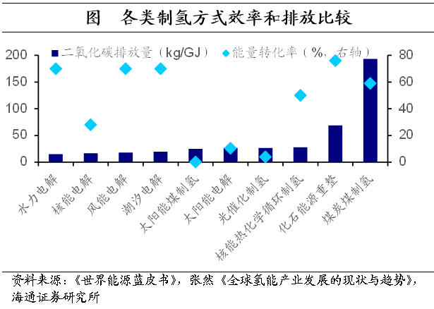 从生产端来看,氢能的优势在于制取、储运便利,相对环保。一是氢能来源广泛,除了以化石燃料制氢外,还可利用风电、太阳能等通过电解水形式制氢。二是储运相对便利,氢可以气、液态存储于高压罐中,也可以固态存储于储氢材料中,相对于以电网运输,波动大、损耗多的风能、太阳能等更具优势。三是相对绿色环保,氢能的燃烧产物是水,在使用可再生能源制氢的前提下能实现零碳排放,而传统化石能源通过制氢,而不是直接发电,其碳排放强度也会有所下降。