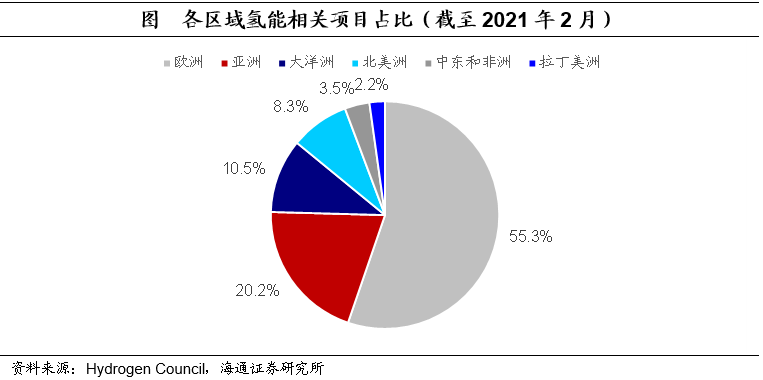 目前我国也是全球发展氢能速度较快的国家之一,在截至2021年初全球投资的氢能项目中,我国占比较高。据国际氢能协会统计,全球氢能产业链上已建成、在建和规划项目共228个,主要分布在欧洲、澳大利亚、亚洲、中东、智利等国家和地区。从地域分布来看,预计欧洲的投资份额最大(约45%),其次是亚洲,而中国占亚洲总投资的50%左右,居首位。
