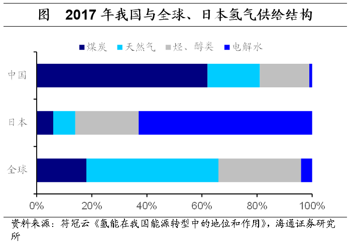 中国当前煤化工行业发展较为成熟,2016年我国煤制氢占比高达62%,相比来看,全球水平氢气供给中仅有18%为煤制氢,而在氢能产业最为发达的日本,其煤制氢的比重仅为6%,电解水制取的绿氢占比高达63%。在以煤炭作为制氢主要来源的情况下,碳排放水平相比直接使用煤炭所差无几,无法达到低碳的要求,所以当前我们面临的一个难点是需要加大研发和应用绿氢制造技术的比例。