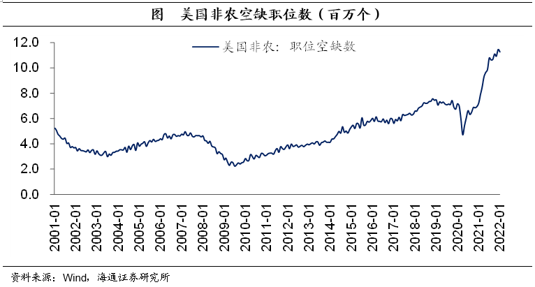 与强劲的需求相比,美国供给端的恢复还是慢了些。当前美国劳动力市场的失业率已经降至4%以下,处于过去几十年的低位水平;非农空缺职位数已经突破1100万,也远远超出疫情之前的水平,反映了美国的劳动力市场已经趋于紧张。