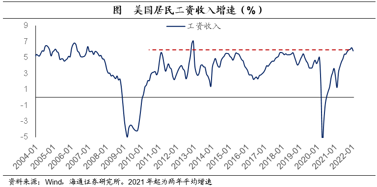与此同时,由于劳动力市场紧缺,美国居民的工资收入大幅上涨,截至2022年初,工资收入两年平均增速为5.8%,而在疫情之前,基本都维持在5%以下。