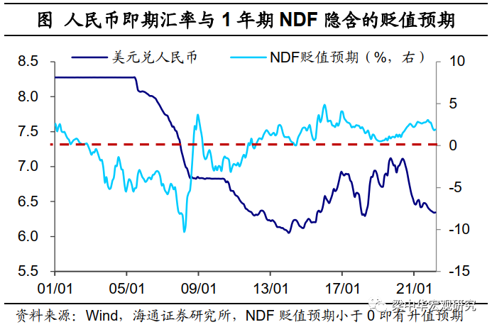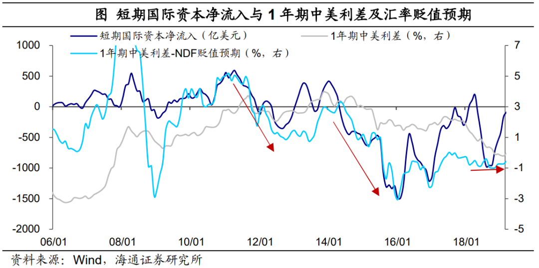 所以短期内,贸易顺差还能支撑汇率,但如果出口回落速度更快,顺差收窄,人民币汇率面临的贬值压力也会更加明显。对比美欧,中美利差对汇率的解释度并不太高。这是因为利率平价主要是从资本与金融账户的角度来影响汇率的变动,对经常账户的传导链条则偏长。那么具体来看,长短端利差的收窄或倒挂对短期国际资本流动会产生多大的压力?利率最直接的作用对象是银行信贷资本的流动,另一方面会影响二级市场收益率,最终影响到证券资本流动。对于境外投资者来说,持有人民币资产的最终收益率还需要考虑未来人民币汇率的走势。如果未来人民币存在升值预期,那么外资流入动力增加,以获取人民币升值的附加收益,反之则会削弱外资流入的积极性。除了依据购买力平价理论外,无本金交割远期汇率(NDF)也可以对人民币汇率贬值预期进行衡量。从实证结果看,1年期中美利差减去1年期NDF汇率隐含的人民币贬值预期,的确可以较好地描述短期国际资本的净流入规模变化。比如在2015年下半年,中美名义利差变化幅度其实并不大,但人民币贬值预期大幅释放,同期的国际资本出现迅速外流。而在2018年下半年的人民币贬值过程中,1年期NDF隐含的贬值预期表现平稳,资本流出压力相对可控,央行对外汇市场的管理力度也明显小于2015年。往前看,我们认为,1年期中美利差减去贬值预期后的降幅或将继续走阔,明显增加短期跨境资本的外流压力。如果利差深度倒挂,汇率产生较强的贬值压力,也可能会对货币政策节奏产生一定扰动。不过贬值预期的变化或相对温和,不大可能重现2015年时的情形。这是因为在2014年主要货币对美元大幅贬值的时候,只有人民币紧盯美元,汇率缺乏弹性,因而贬值压力其实积蓄已久,在短期内集中释放带动国际资本加速流出。而如今我们的汇率弹性已经明显增强,本轮人民币并没有积蓄明显贬值压力。所以只要汇率预期较稳,单纯的中美利差对资本流动的影响相对较小,关键还是看中国未来的政策,以及经济和市场的机会有多大。对资本市场的影响方面,首先债券市场可能会受到中美利差的扰动。在债券市场逐步开放以后,中美利差就和外资购债行为有了较高的相关性。NDF贬值预期调整后的中美利差可以反映我国债券的性价比,如果调整后的利差降幅扩大,境外机构持有我国国债的意愿就可能明显下降,比如2015年和2018年期间。因而今年2月和3月期间境外机构持债规模已分别下滑670亿元和980亿元,除了地缘政治的影响外,利差变化也起到重要的推动作用。截至今年3月,贬值预期调整后的中美利差降幅已经高于2018年利差收窄阶段,如果短端利差深度倒挂加上贬值预期进一步上行,那么债券市场面临的资本流出压力可能超过2018年时期。但中国的债券存量主要还是国内的金融机构持有,外资如果不是规模性的大幅流出的话,不会因为外资抛售而导致我国利率上行。国内的利率走势,主要还是决定于国内的基本面和货币政策变化。股市方面,关注国际局势与市场本身的影响。相较债市,中美利差、贬值预期与股市外资流动的相关性偏弱。回顾2018年时期,随着中美利差的收窄,北上资金的净流入规模有所下滑,但绝对水平并不低。在18年10月中美贸易摩擦升级带动资金净流出105亿元以后,11月到次年2月陆股通月均流入量依然在460亿元的较高水平。3月陆股通北上资金净流出规模达490亿元,但我们认为,中美利差的收窄并不是主因。股市外资流出更多受到俄罗斯与美欧制裁持续升级的扰动,另外,我国基本面数据偏弱或也有影响。接下来如利差继续收窄,对股市外资的扰动或也相对有限,而且在去年互联网等政策调整下,外资的风险已经进行了提前的释放。如果接下来政策更加稳定,稳增长政策逐步见效,基本面出现持续的改善,则国内股市对外资的吸引力反而有望增强。