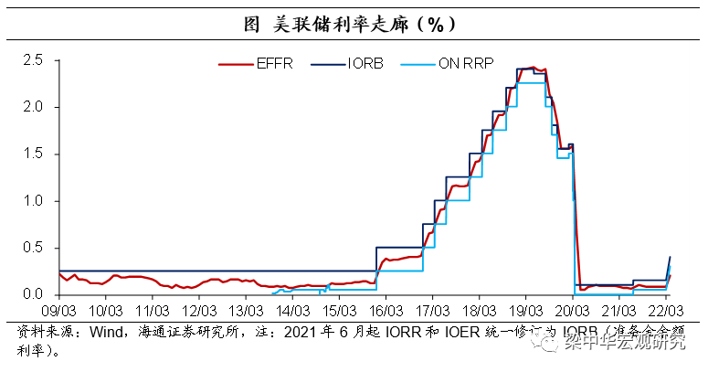 金融危机后美联储主要通过利率走廊体系来实现目标。所谓利率走廊,即设置好利率的上限和下限,通过调节利率的上下限来实现目标利率。当前美联储设置的利率上限为准备金余额利率(IORB),即美联储向银行体系支付的准备金利息;利率下限为隔夜逆回购利率(ON RRP),即美联储向货币市场基金等非银金融机构支付的抵押逆回购利息。