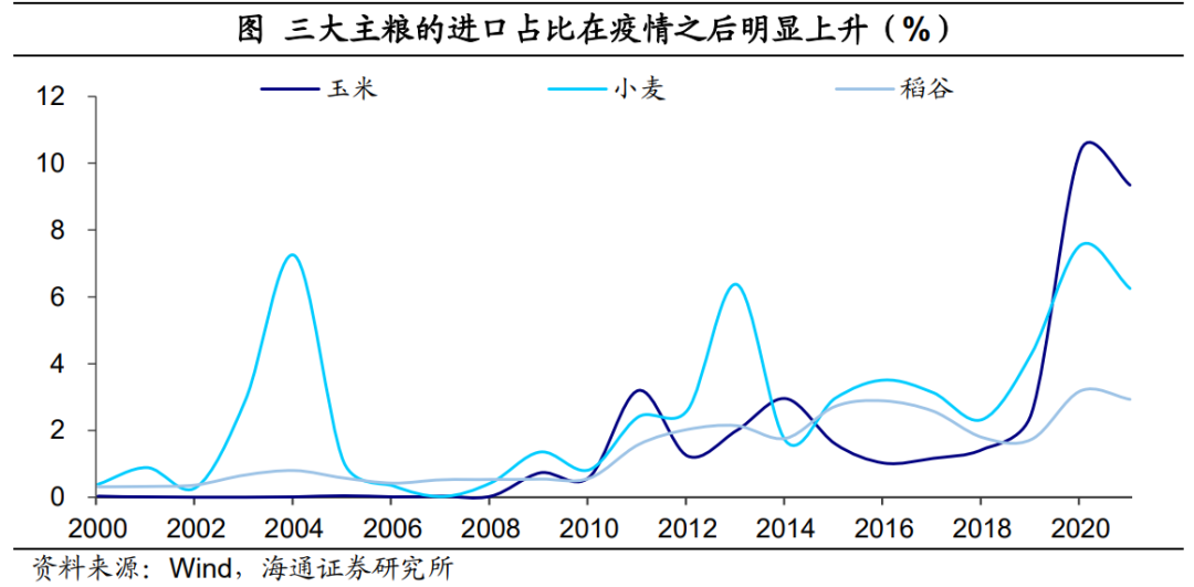 疫情以后玉米和小麦进口占比有所增加,但三大主粮的对外依赖度整体仍较低。从对进口的依赖看,长期以来我国稻谷、小麦和玉米基本可以实现自给自足,进口占国内总消费的比重较低,截至2020年疫情前,依赖度最高的小麦进口量也仅占4.3%。