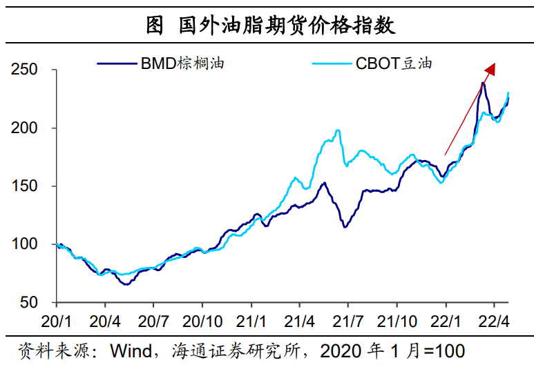 更需要担心的是全球贸易保护主义的升温,或将在供给整体偏紧的背景下加剧结构性矛盾。通常粮食短缺、价格上涨会加剧各国惜售、囤粮意愿,3月的时候已经有许多地区宣布减少甚至禁止农产品的出口。而随着农产品、能源价格的继续走高,为了平抑内部的物价,很可能会有更多的地区加入贸易保护行列,这也将导致供给短缺进一步加剧,推动价格上涨。比如,4月24日开始全球的油脂价格又出现非常快速的上行,最主要的触发因素就是印尼政府宣布全面禁止棕榈油的出口。