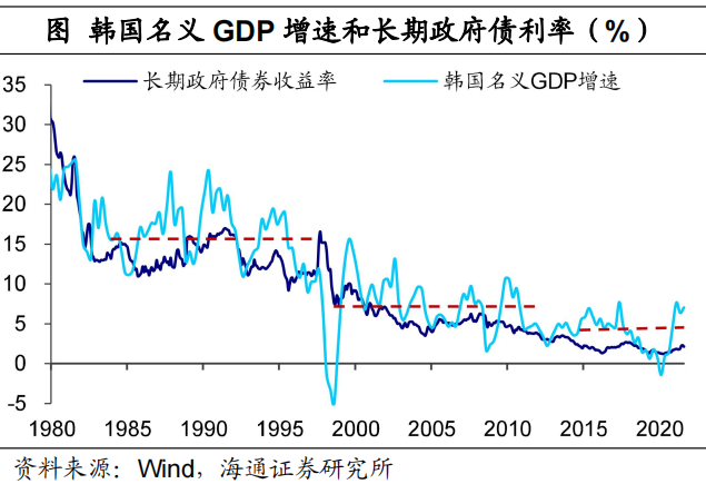 中美10年期国债利率近期出现了倒挂,这是过去十多年未出现过的现象,所以我们有必要从一些中长期的视角,来思考一些关于利率的本质问题。本文作为我们利率系列研究专题的第一篇,重点研究利率和经济增速的关系。从主要经济体的表现来看,利率水平往往和经济增速水平相当,但我国过去经济增速高的时候,利率其实也不高,似乎出现了高增长、低利率的情况。我国利率是否存在低估?什么决定了利率水平?未来利率的趋势是什么?根据“利率黄金法则”,在最大化消费的条件下,理论上经通胀调整后的真实利率r应该与实际经济增长率g相等,换言之,一国的长期名义利率与名义GDP增速水平应大致相当。实证检验显示,这个理论对于海外发达经济体通常都是成立的。比如,美国的10年期国债收益率最高在1980-1985年左右抬升到10%以上水平,同期美国的经济增速也长时间处于10%以上;此后在90年代,美国经济增速换挡,平均增速在5.5%左右,10年期美债利率也降至6.7%的平均水平;2008年以来的十年间,名义GDP增速和美债利率均值进一步分别降至3.0%和2.6%。总体上,各阶段美国名义利率和名义经济增速中枢都在很接近的水平。东亚经济体中的日本和韩国,拉长时间来看,两地的长债利率水平也基本接近当地的名义经济增速,尤其是在几轮经济增速换挡期间,当地的利率都出现同步的下移。![]()