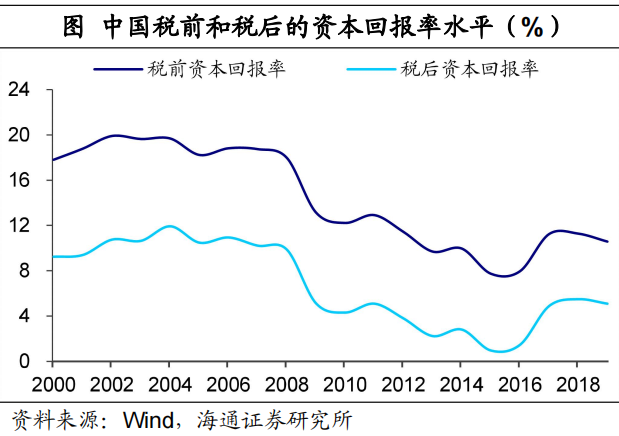 所以从利率与经济增速的相关性角度看,似乎我国的利率水平是明显偏低的。为什么我国的利率水平会明显低于经济增长水平?这是否意味着我国的利率被长期低估?分析这个问题之前,我们先要来回答,是什么决定了长期的利率水平。表面上看,是各国央行决定了政策利率的走势,但央行在决定利率的时候其实是被动的,最终是根据实体经济的变化被动调整政策利率,尤其是受到资本回报率的影响。简单的理解,在借贷市场上人们借入一单位资本能够获得的收益,至少应该覆盖借入该单位资本所支付的利息。所以本质上决定一个国家利率水平高低的并不是央行,而是当地的资本回报水平高低,资本回报率越高,越能够支撑利率的走高。资本回报率等于资本收入份额除以资本产出比,加上资本价格上涨扣除通胀后的资本溢价,再减去资本折旧。其测算方法可以分为微观企业法和宏观测算法。我们主要采用宏观层面的指标进行测算,实际结果显示,相比名义经济增速,我国的资本回报率水平是偏低的,对利率水平形成了抑制,所以我国的利率水平与经济增速差距较大。2002-2008年我国资本回报率平均在10.6%水平,远低于当期16.4%的经济增速。2012年以后,我国资本回报率大幅下滑到4.8%的平均水平,与名义经济增速均值依然有4.5个百分点左右的差距。而相比之下,同期的国债利率水平约为3.5%,与资本回报率更为接近。这里需要说明的是,我们测算得到的是整体资本回报率,而对于利率来说,决定利率水平的主要是当期边际资本回报率。随着资本的大量积累,边际资本回报率是会递减的。因此从理论上说,利率水平也应该低于整体的资本回报率。![]()