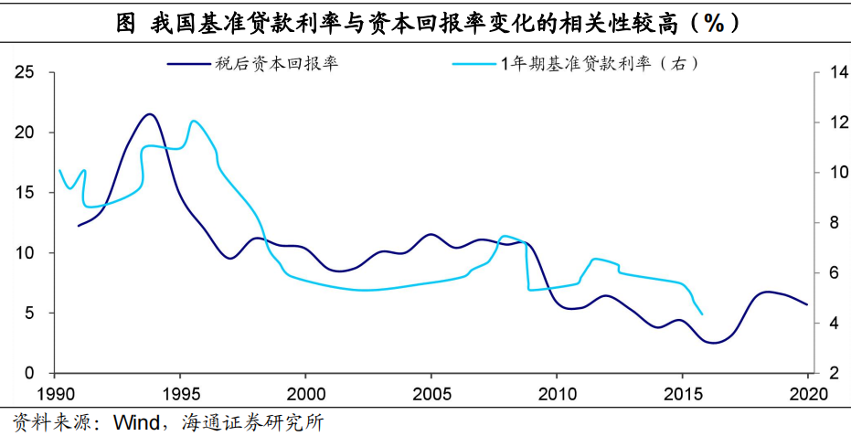 回顾历史来看,我国基准贷款利率的走势的确与资本回报率变化呈现较强的相关性。上世纪90年代中期和2008年后,我国资本回报率均出现过明显回落,同期政策利率也随之下调,使得经济中的资金成本能够与基本面决定的资本回报率相适应。![]()