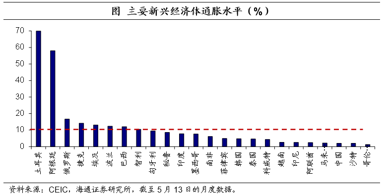 从通胀来看,多数新兴经济体饱受高通胀的困扰。截至4月,土耳其通胀水平上行至70.0%,阿根廷通胀水平也上行至58.0%,远远高于各自央行5%的通胀目标。而俄罗斯、捷克、埃及、波兰、巴西以及智利等通胀水平均在10%以上,匈牙利、秘鲁、印度、墨西哥以及南非等通胀水平也均在5%以上,均高于各自央行的通胀目标水平。