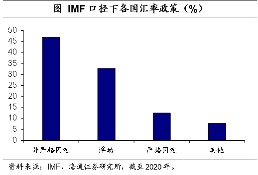当前全球主要经济体货币政策的独立性相对有限。据IMF统计,截至2020年,全球实行浮动汇率政策的经济体仅占 32.8%。而且从实践角度看,即使是实行浮动汇率的央行,也没有让货币完全自由浮动,各国央行都在频繁的干预外汇市场。