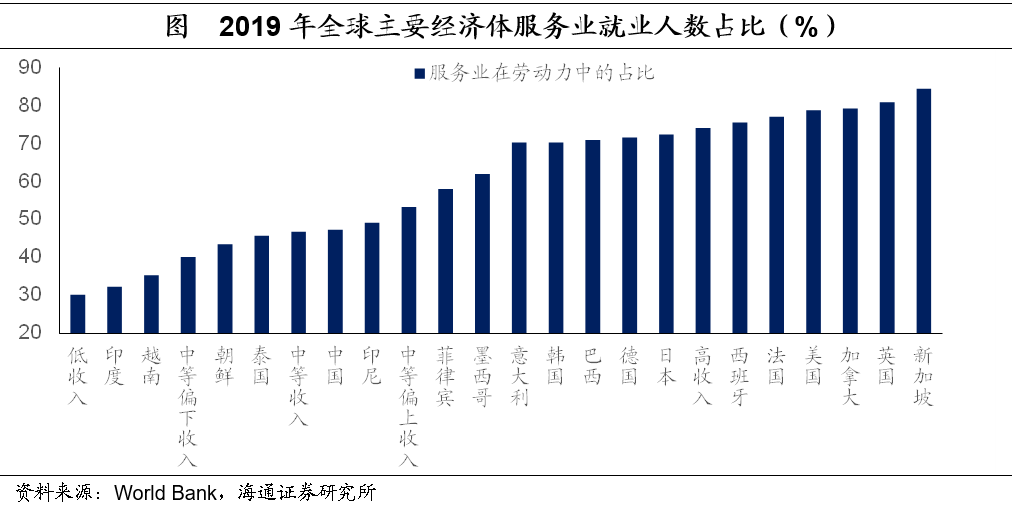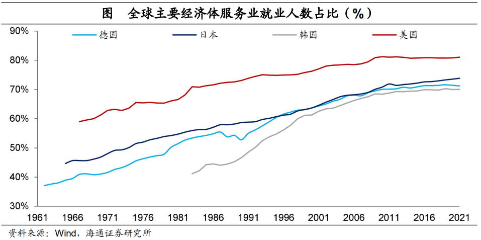与工业就业占比下降相对应的是,服务业就业占比的大幅提升。截至2021年,美国服务业就业占比为81%,德国为71%,日本为74%,韩国为70%。从全球来看,发达国家的服务业就业占比普遍在70%以上,而我国当前服务业就业占比还不到50%,其实还存在一定的提升空间。
