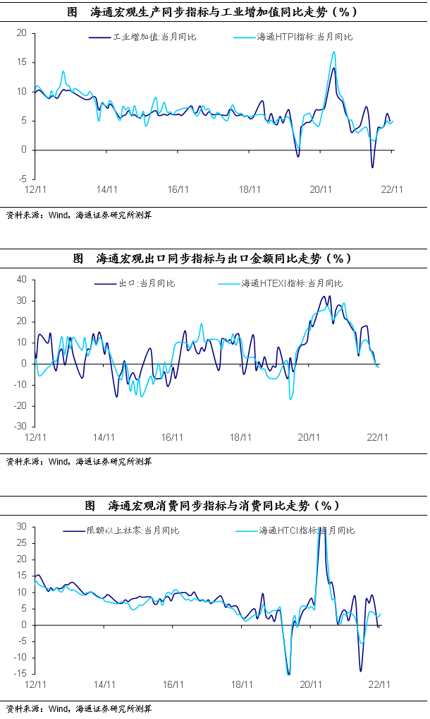海通宏观高频同步指标:生产消费小幅改善,出口走弱。截至11月13日,11月生产同步指标(HTPI)为5.0%,10月值为4.79%;11月出口同步指标(HTEXI)为-1.62%,10月值为-0.08%;11月消费同步指标(HTCI)为3.50%,10月值为2.54%。